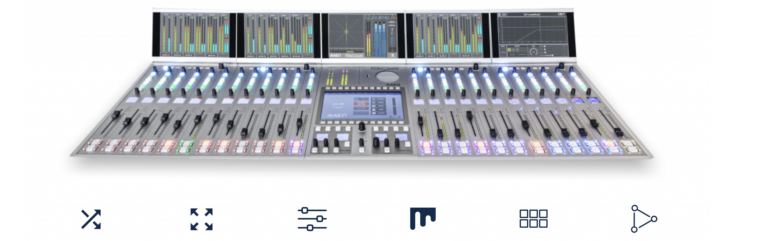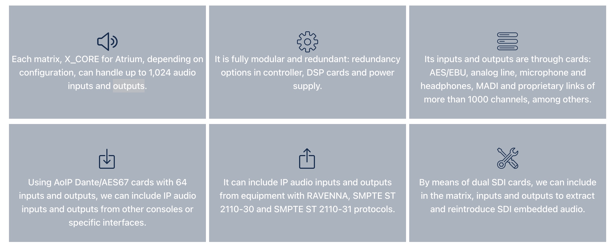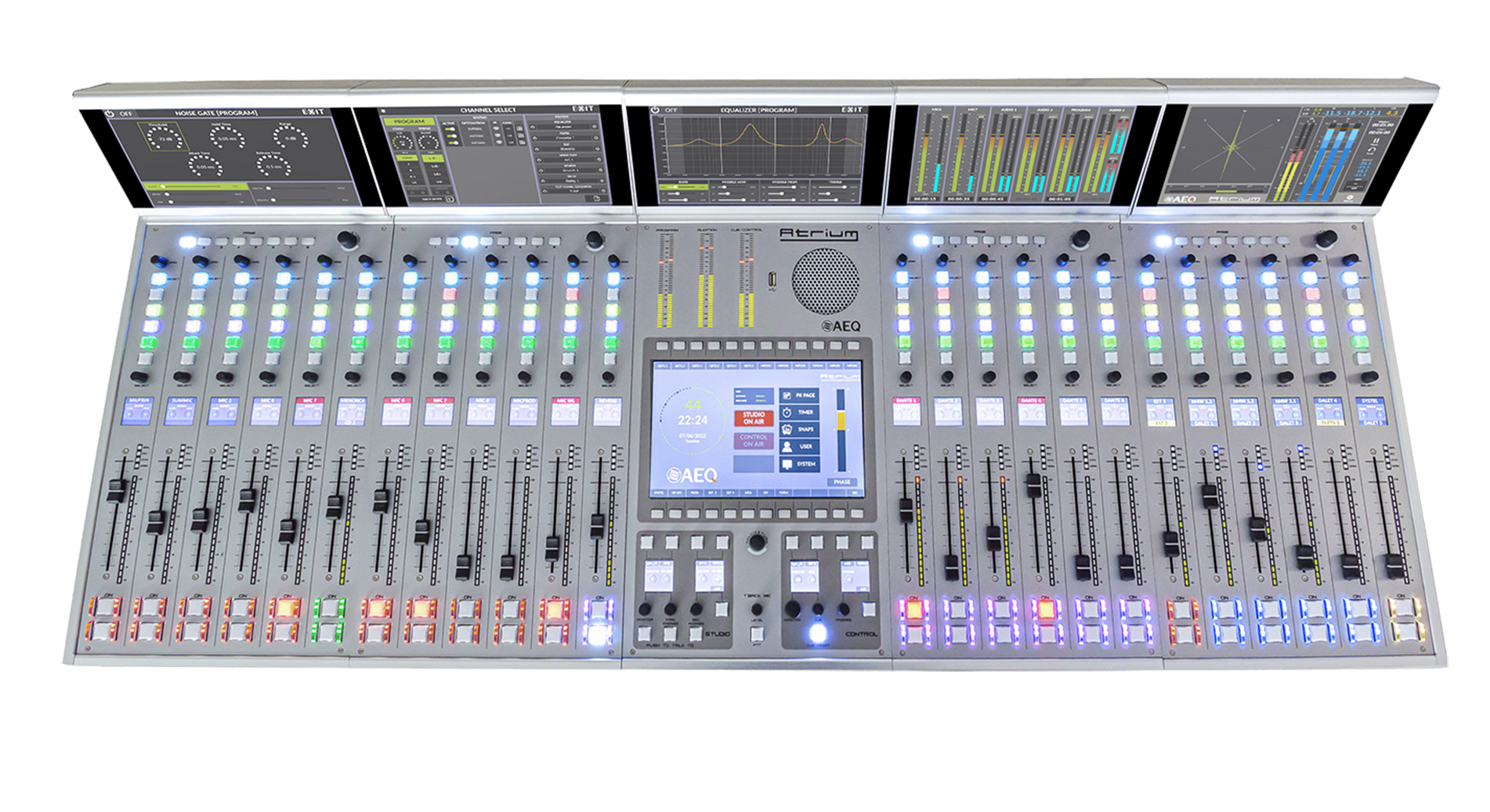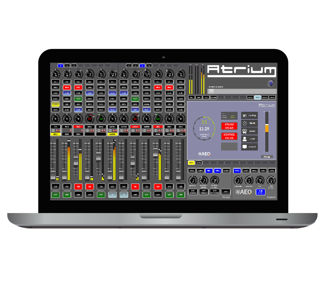 ATRIUM je digitální audio mixážní pult speciálně navržený pro rozhlasovou a televizní produkci a vysílání v těch nejnáročnějších pracovních podmínkách. Zvládá až 1000 kanálů lokálního nebo IP audia ovládaných přes jednu či více ovládacích ploch, z nichž každá disponuje až 90 motorizovanými fadery s možností přepínání vrstev (stránek).